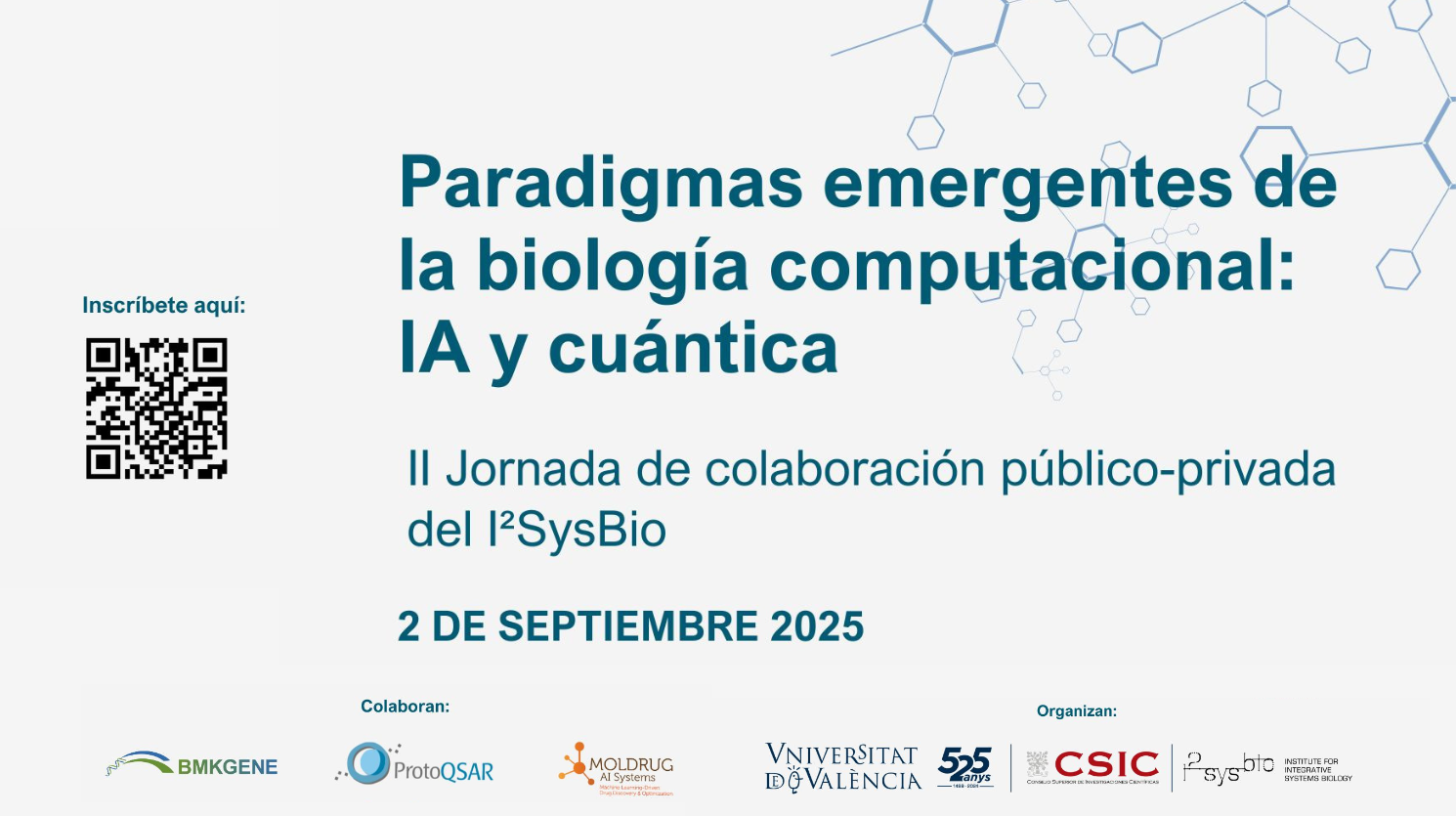 Bajo el título Paradigmas emergentes de la biología computacional: IA y cuántica, esta edición se centrará en explorar y debatir las aplicaciones de la Biología Computacional, la IA y la cuántica, en el campo de la biotecnología, la biomedicina y las tecnologías disruptivas.