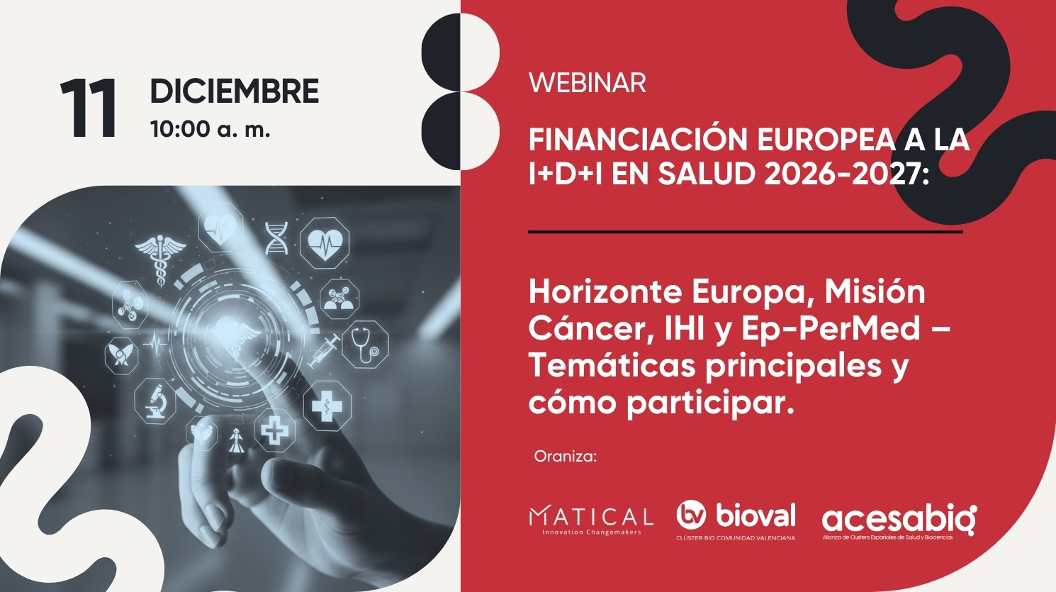 Seguiremos con el programa IHI -Innovative Health Initiative- (modelo de cofinanciación, actores industriales y tipo de proyectos que se financian) y el programa EP PerMed - European Partnership for Personalised Medicine- (focos, convocatorias y encaje con medicina personalizada clínica y digital).